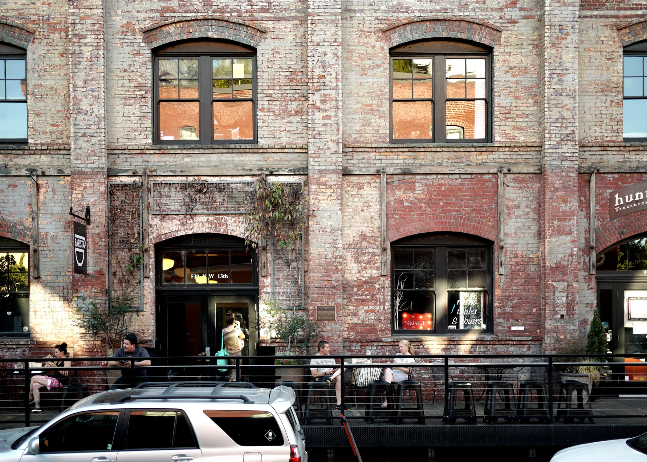 It is the rejuvenation of a space once abandoned when Portland outgrew its industrial beginnings. The rail platforms that appear frequently within the neighborhood, have evolved into an elevated boardwalk for outdoor seating and passage for the diverse array of cafés, gastropubs, shops, and residential units that now occupy the warehouses behind. People flock to the many urban parks and public squares that have been installed throughout the area. Pedestrians, cyclists, automobiles, streetcars and buses all comfortably share the road, creating an ease of access to the rest of downtown.